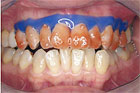 表面麻酔後に歯ぐきに薬剤を塗ります。治療後歯ぐきが白くなり2~3日後に薄い膜となって自然にはがれます。その後1~2週間でピンク色の歯ぐきに変わります。